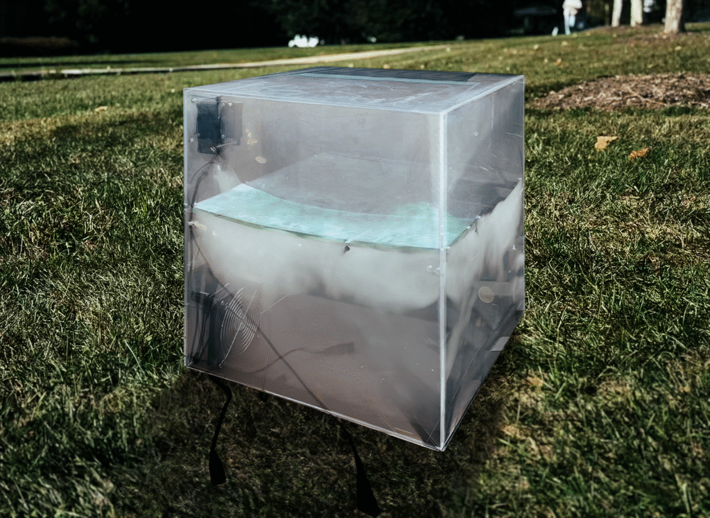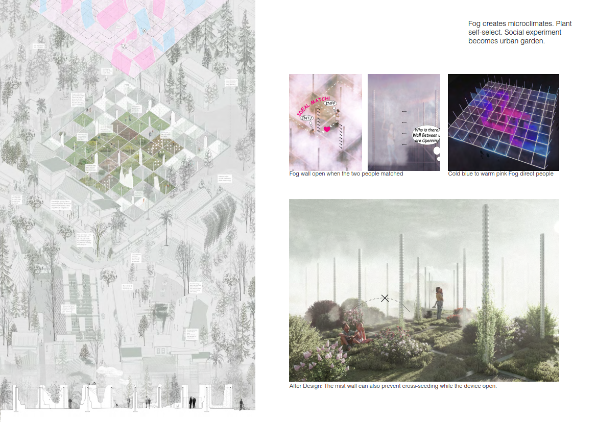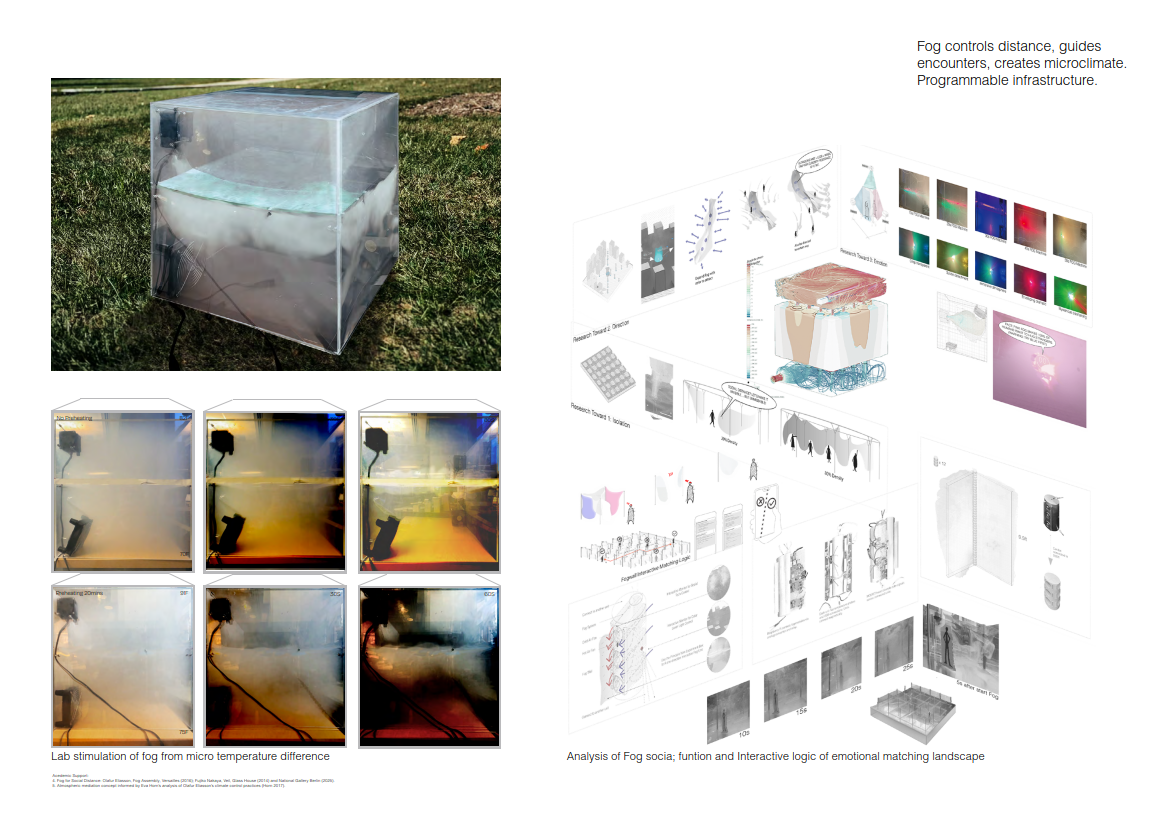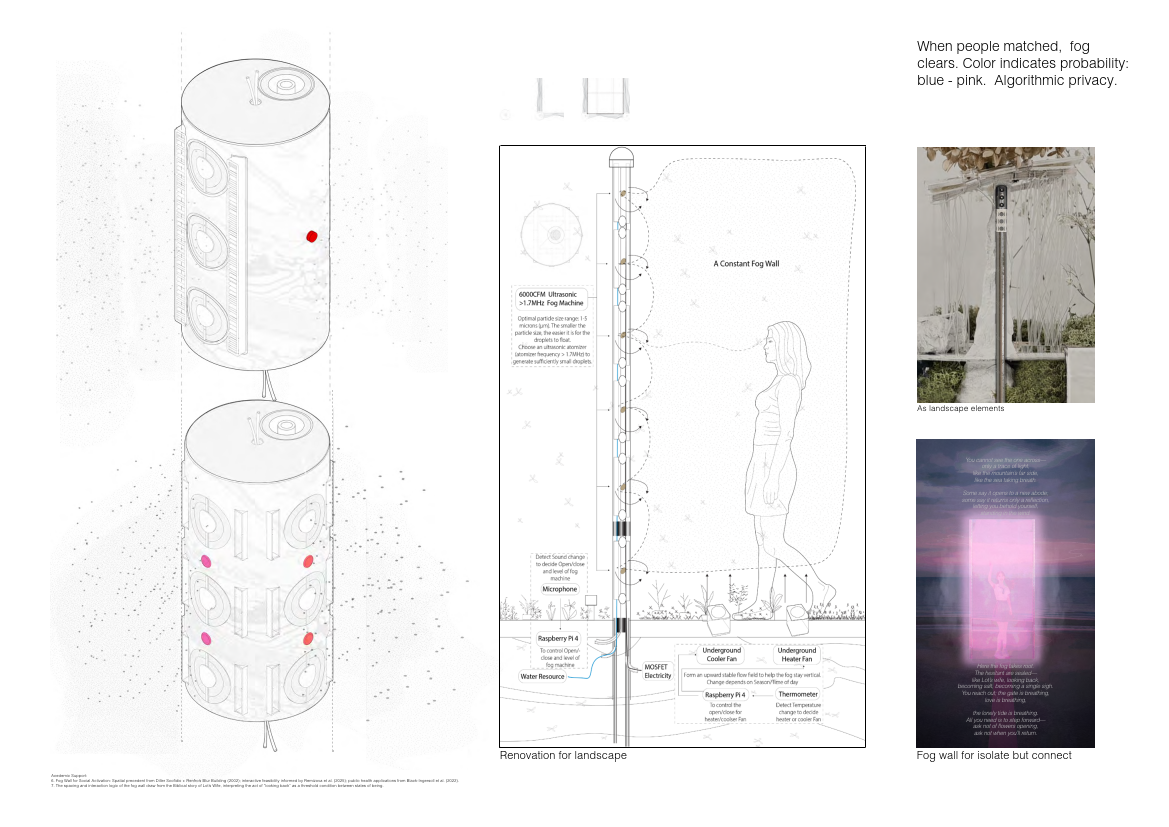 Ultrasonic fog atomization tests how humidity, temperature, and visibility modulate social distance, interactive collective occupation and microclimate garden. Fog as programma-ble atmospheric material for public space.