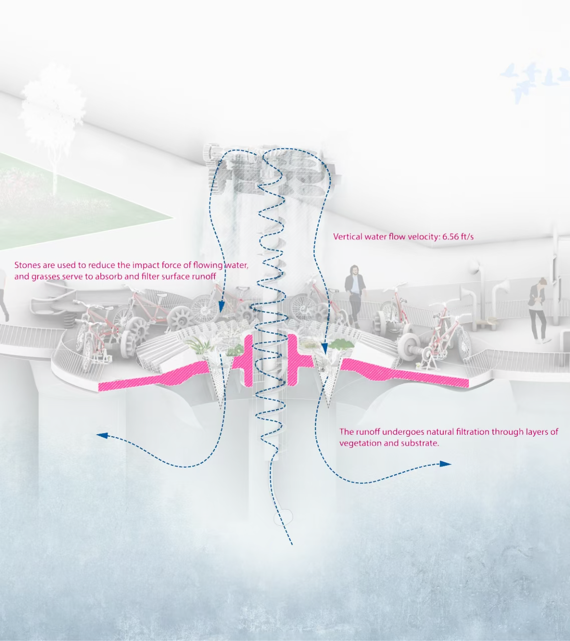 Mechanical system design, energy conversion analysis, hydrological filtration, site choreography