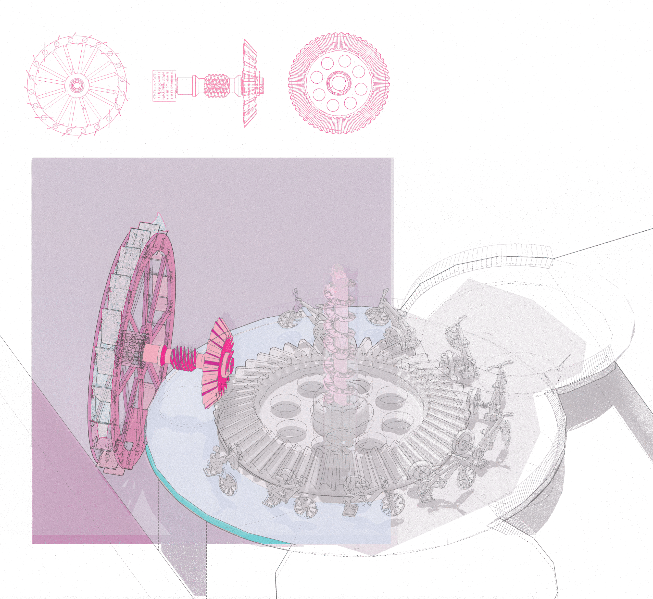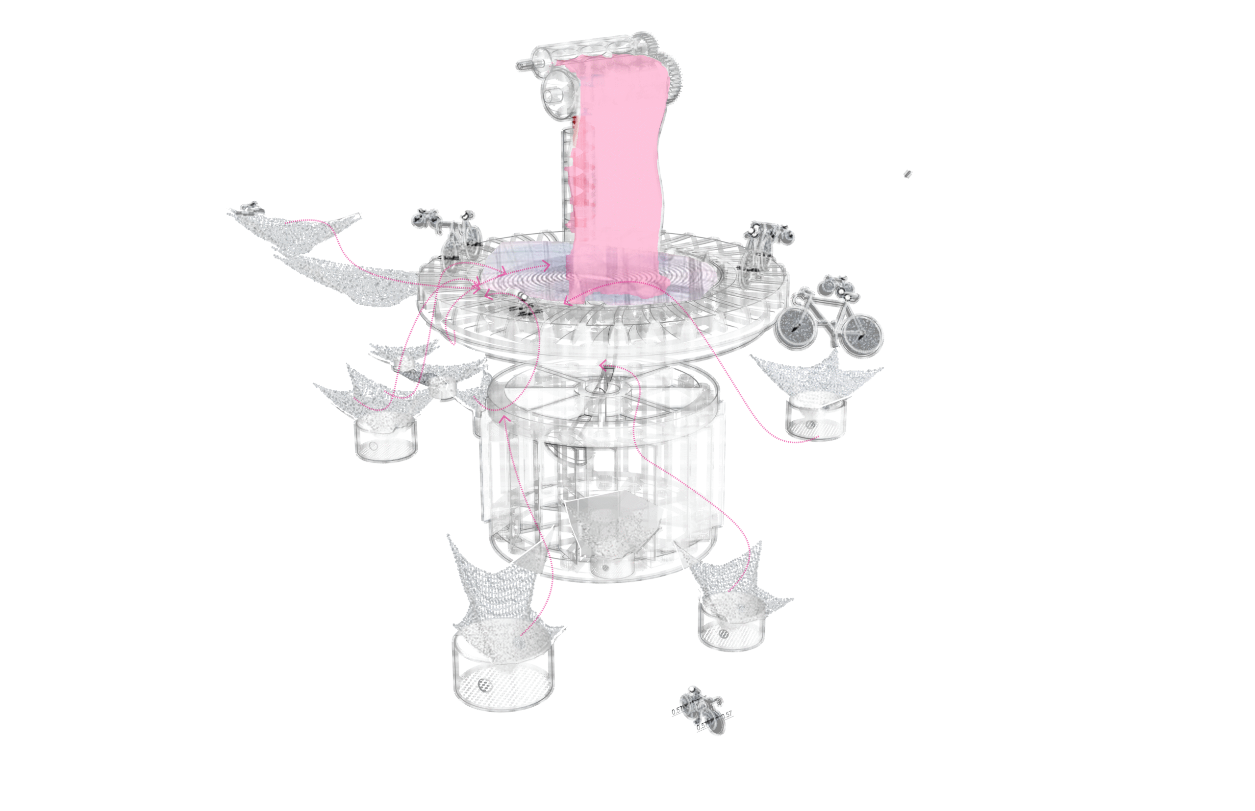 Kinetic infrastructure where cyclists power an Archimedean screw while tidal current co-drives a waterwheel. Water cascades through mechanical gears, filters through native wetlands, returns to the East River. Metabolic cost visible